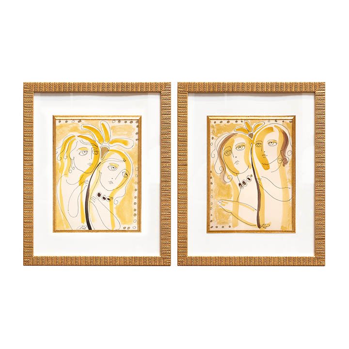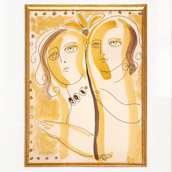 Pair of watercolor and ink on paper twin portraits painted in a whimsical manner. Both belong to the "Love" collection of Ukrainian artist Oxana Roumelides (Roxani) and are inscribed with the numbers I and III. During the early 2000s, Oxana Roumelides resided in Greece, drawing inspiration from Greek mythology and the poetry of her homeland.