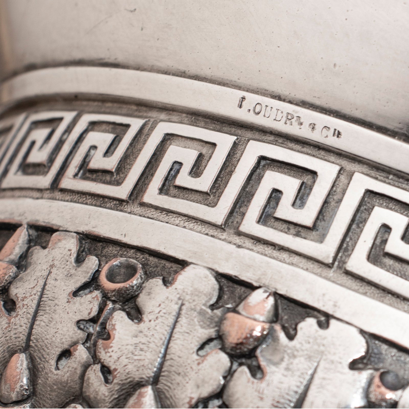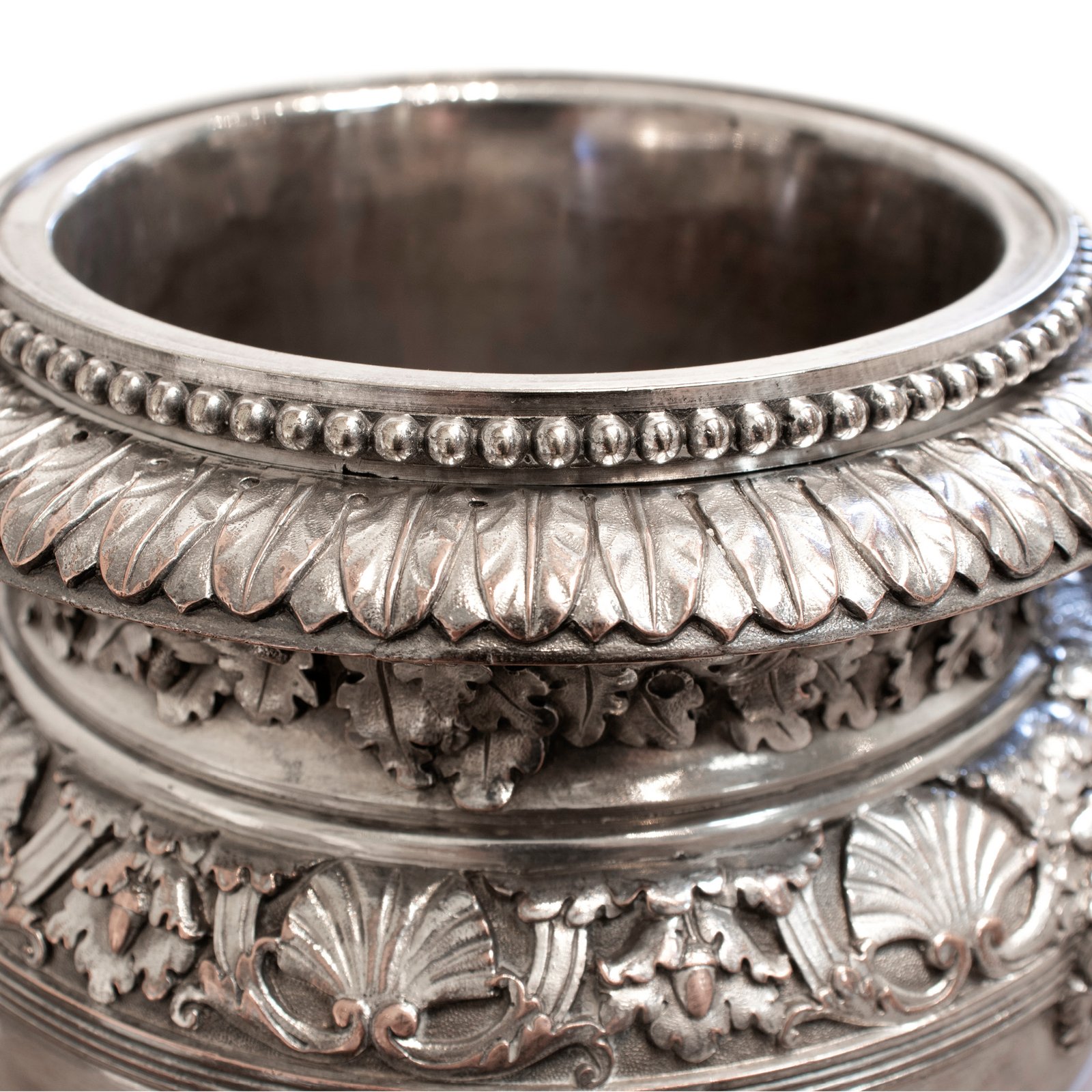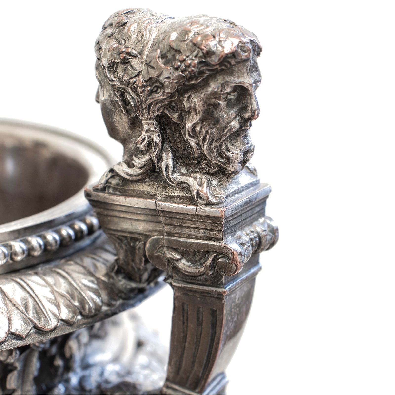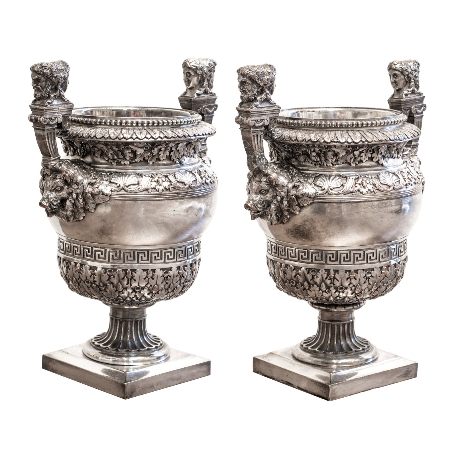 Pair of silvered bronze vases with Janus heads on holders, produced by cast after Claude Ballin (1661–1754). The body and rims are decorated with acorns and oak leaves under a Greek Key frieze.
