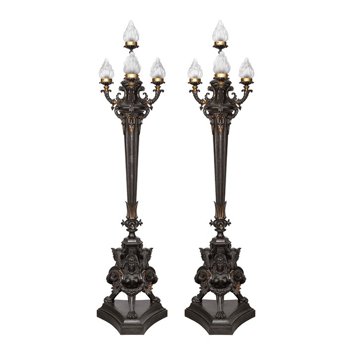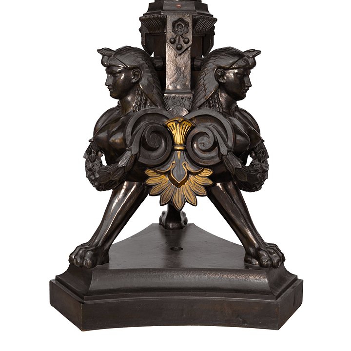 A monumental pair of electrified candelabras in patinated bronze and cast iron, originally designed as gasoliers. Each features a fluted, tapering column rising from a triform base formed by three seated female sphinx monopodia. The upper section branches into five scrolling arms with flame-shaped glass shades.