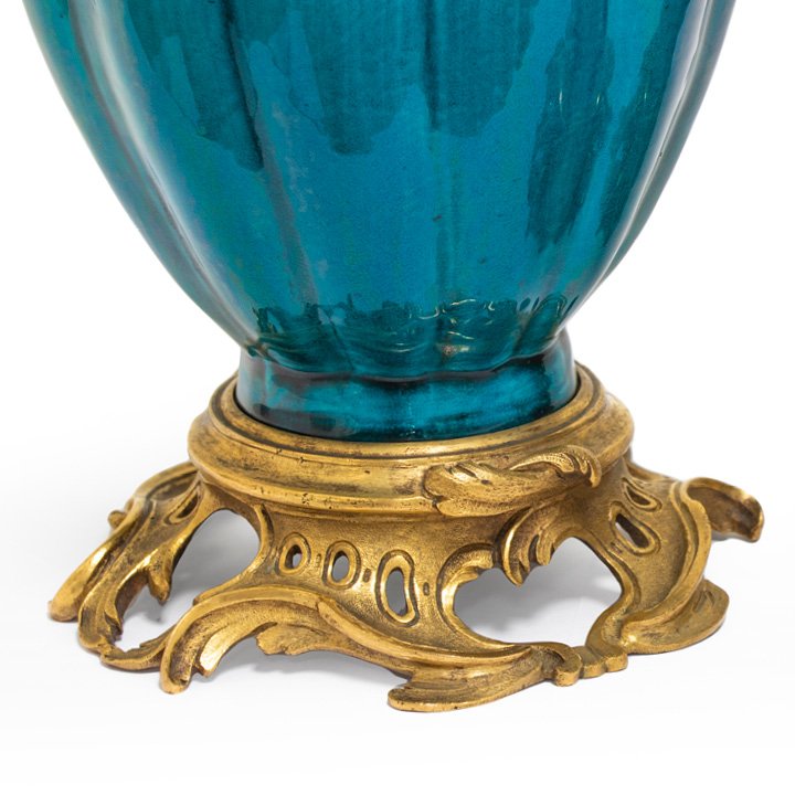 Pair of turquoise blue fluted oviform vases on bronze pierced rocaille scrolls bases. The top foliate cast lid can be opened. Each vase has two handles with stylized "Kui" dragon holding bronze garland rings.