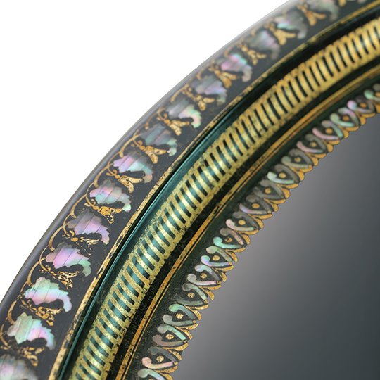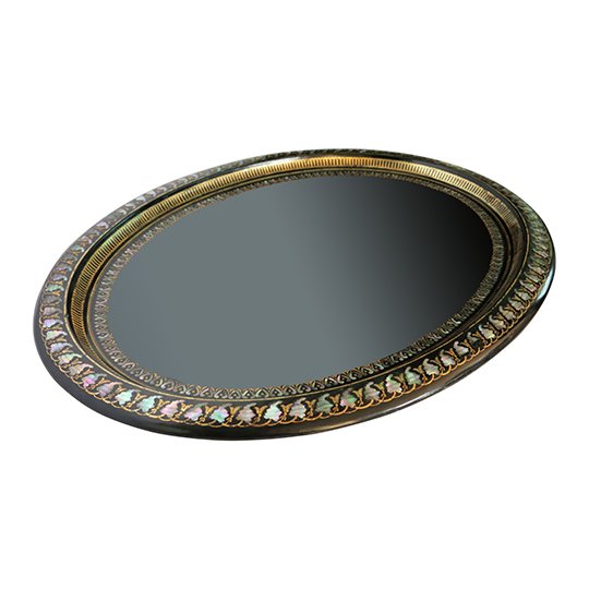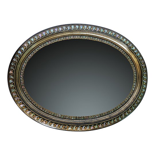 An oval papier-mache tray enameled with mother of pearl and a fine gilded decorative frieze around the border.