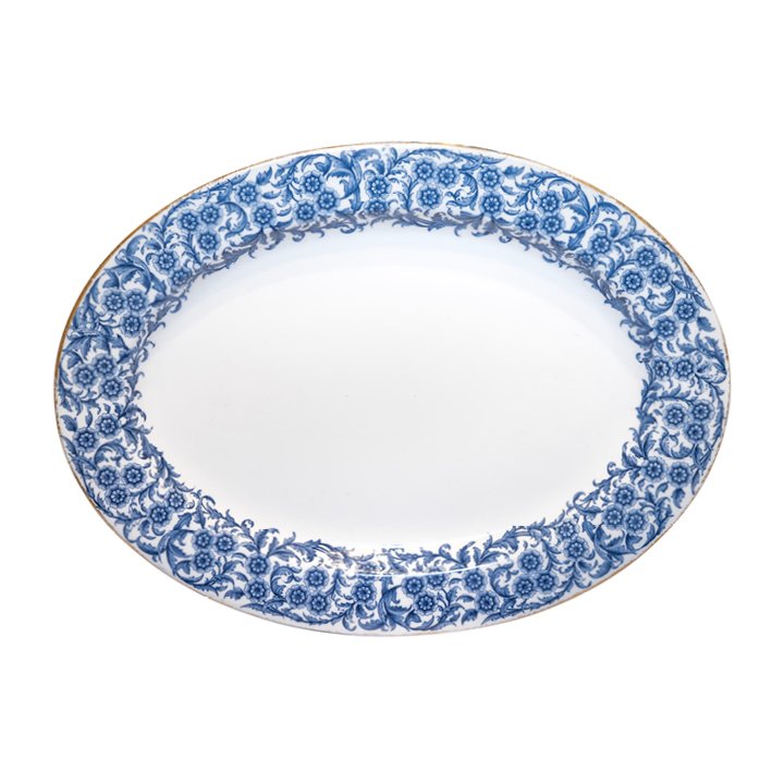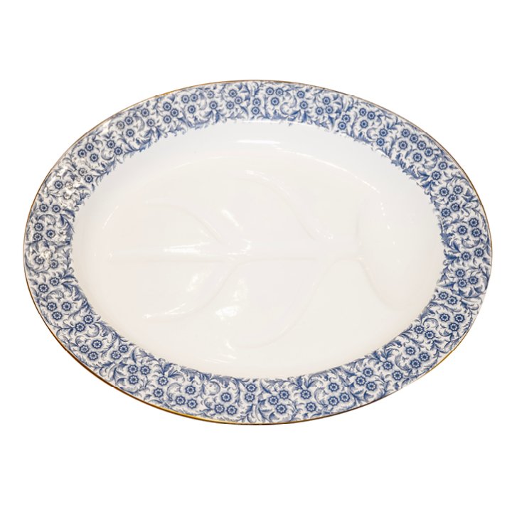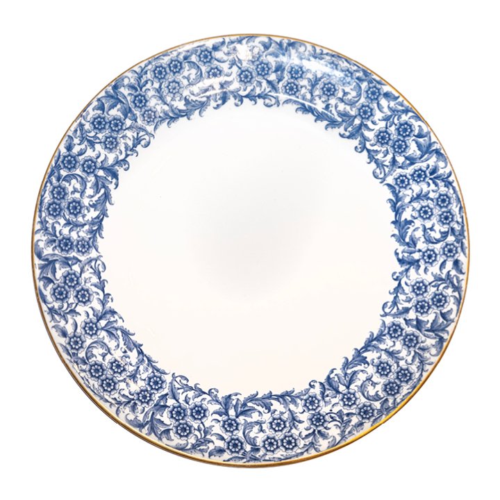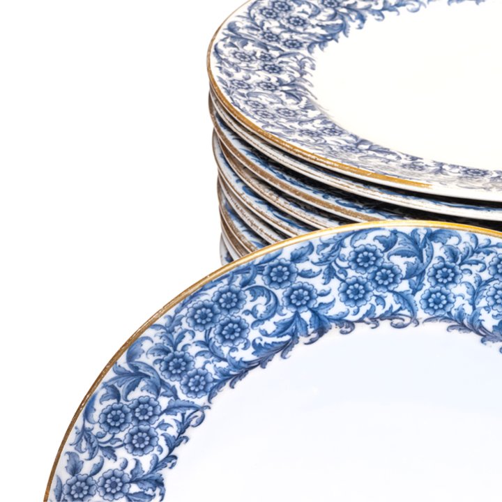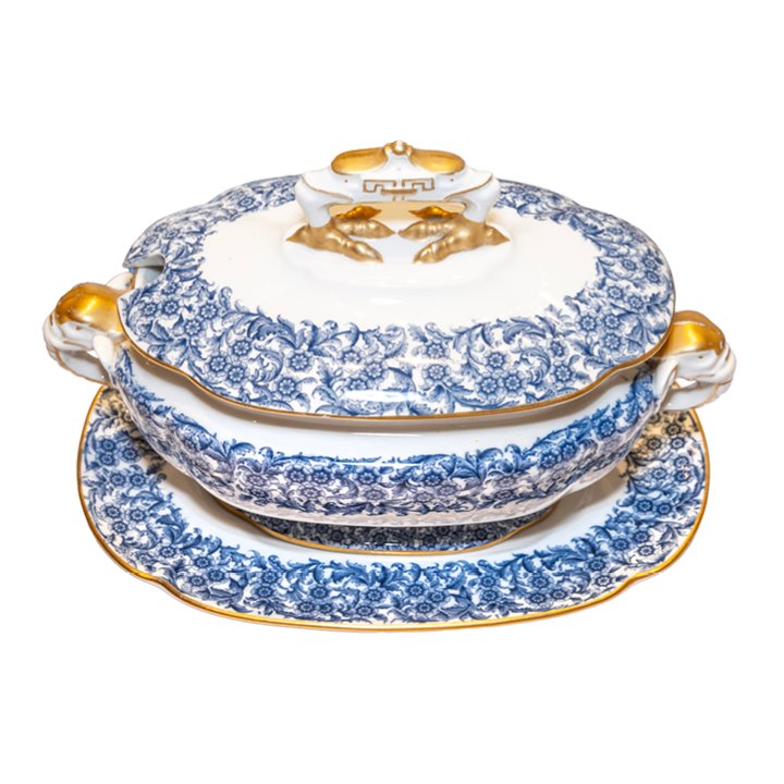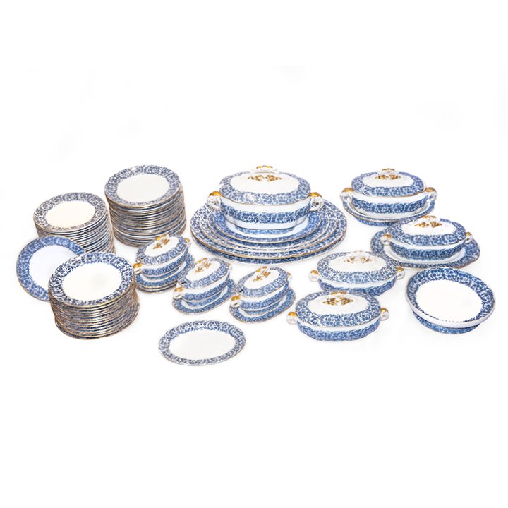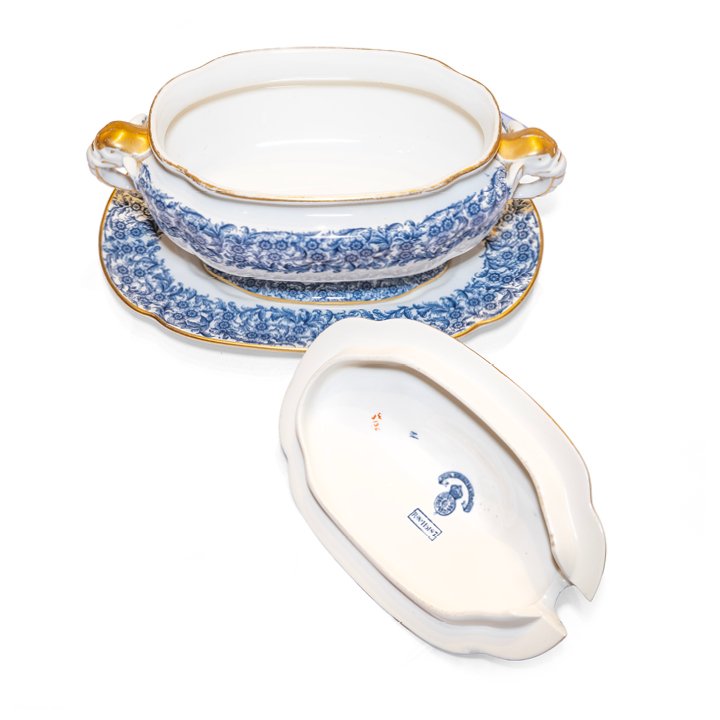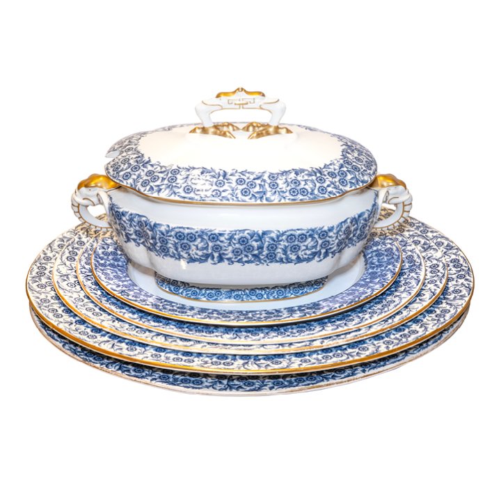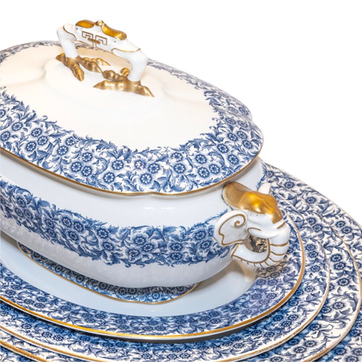 Partial dinner set by Royal Worcester, adorned with blue-on-white floral motifs on the rims (pattern number 115187) and gilt figural elements (elephants side handles and birds feet lid handles).