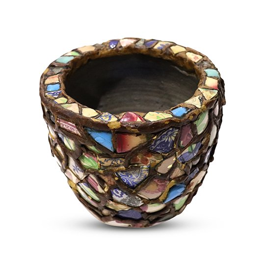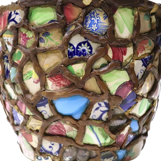 A "Pique Assiette", which translates as thief of plates in French, mosaic pot that could be used as decorative center piece on a table or as a decorative object on a shelf. The interesting use of chips of different broken antique ceramic placed together using clay as a base.