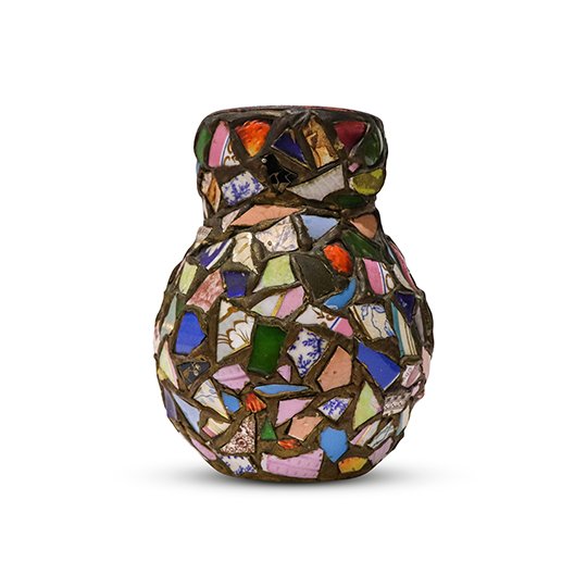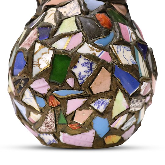 A "Pique Assiette", which translates as thief of plates in French, mosaic vase that could be used as decorative piece on a table or as a decorative object on a shelf. The interesting use of chips of different broken antique ceramic placed together using clay as a base.