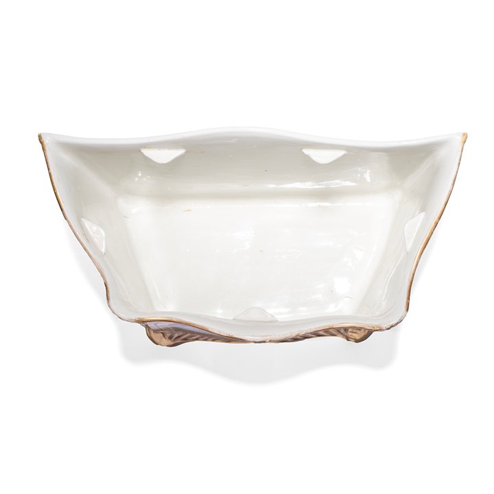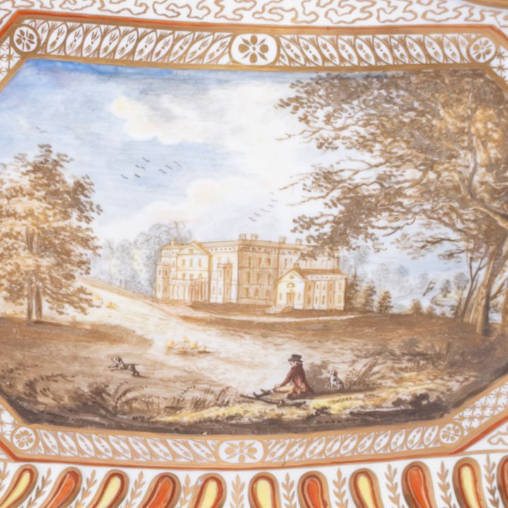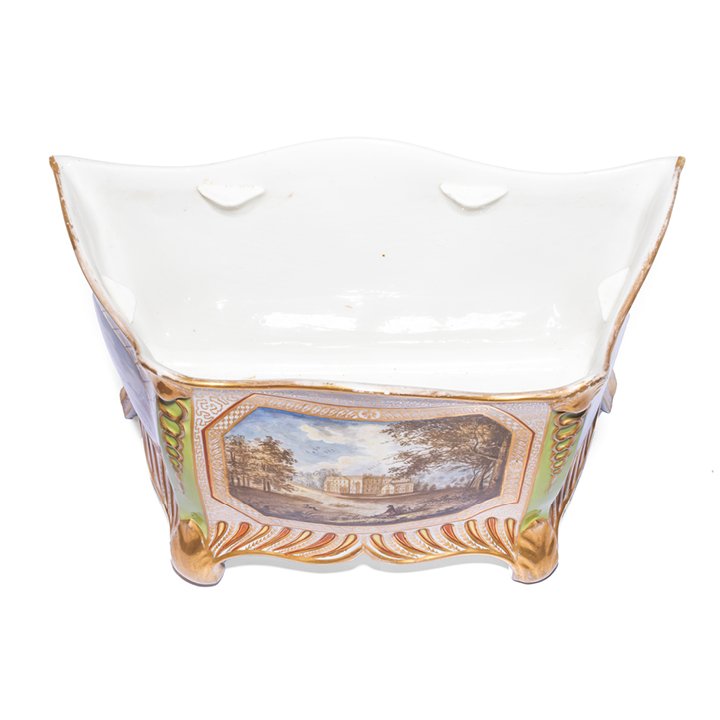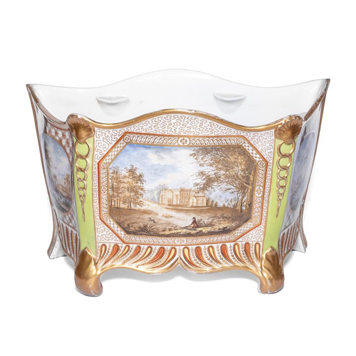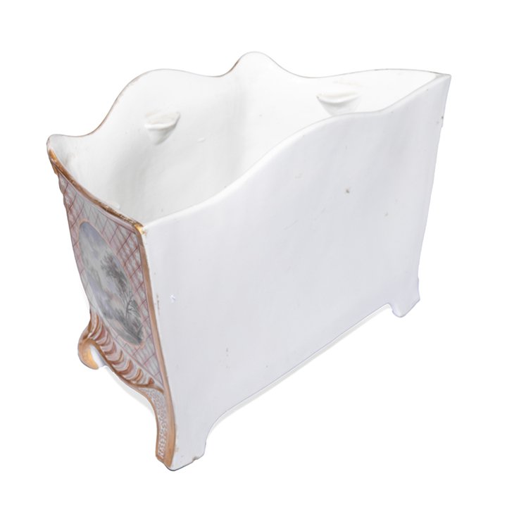 Porcelain jardiniere (planter) from English company Coalport. Raised on four feet and decorated with three oval compositions of country landscapes on a checkered background. Parcel gilt, great antique condition.