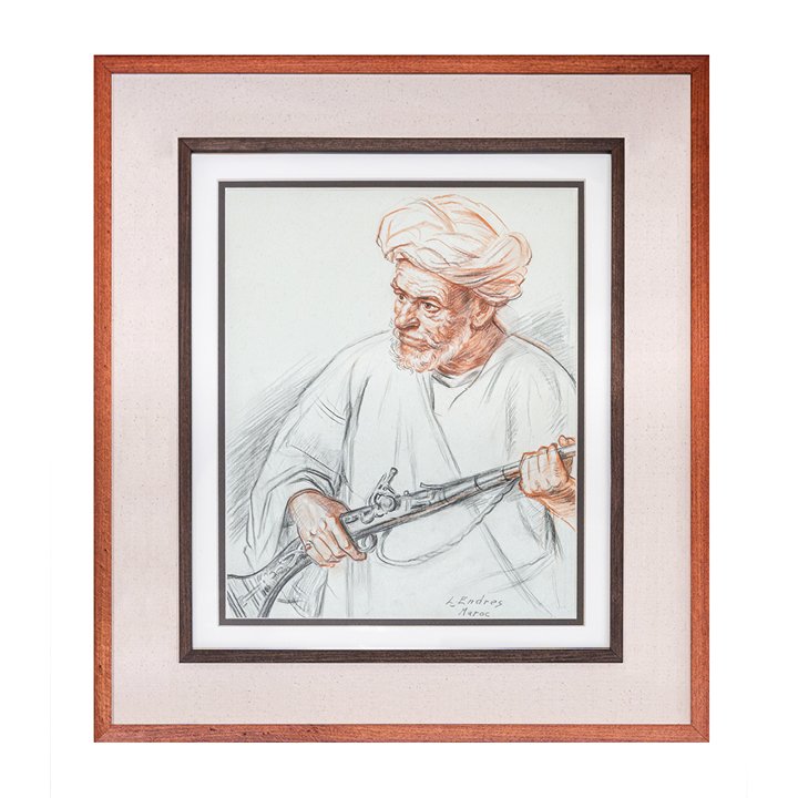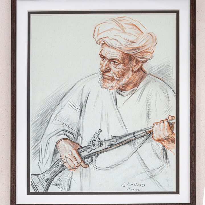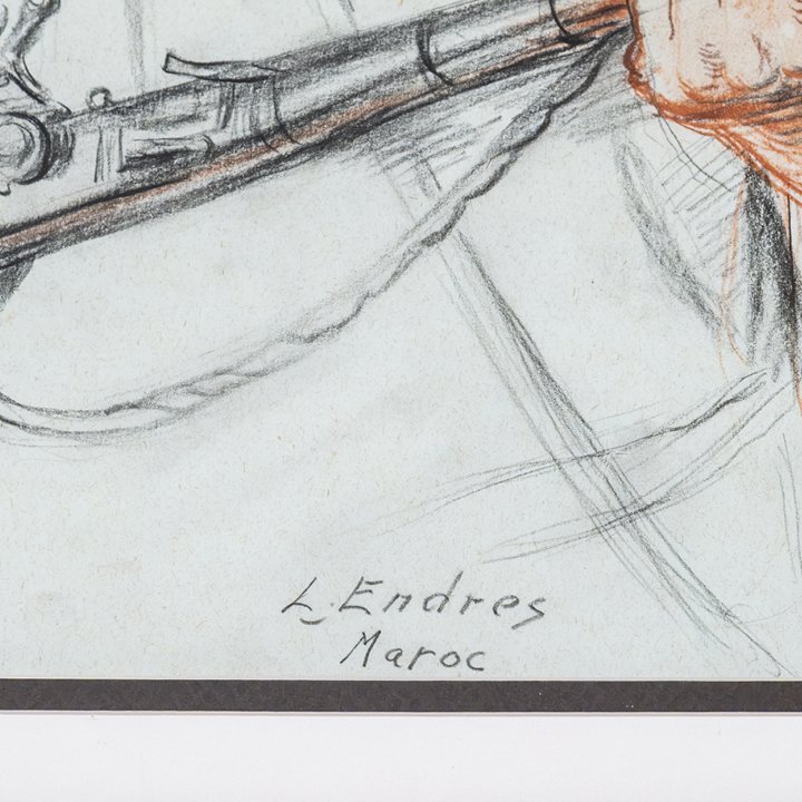 A drawing of a man figure holding a rifle, created in sanguine, black chalk, and pastel on tinted paper. Signed "L.Endres" lower right. Newly mounted in one wooden frame under glass.