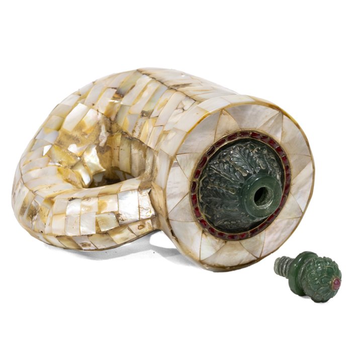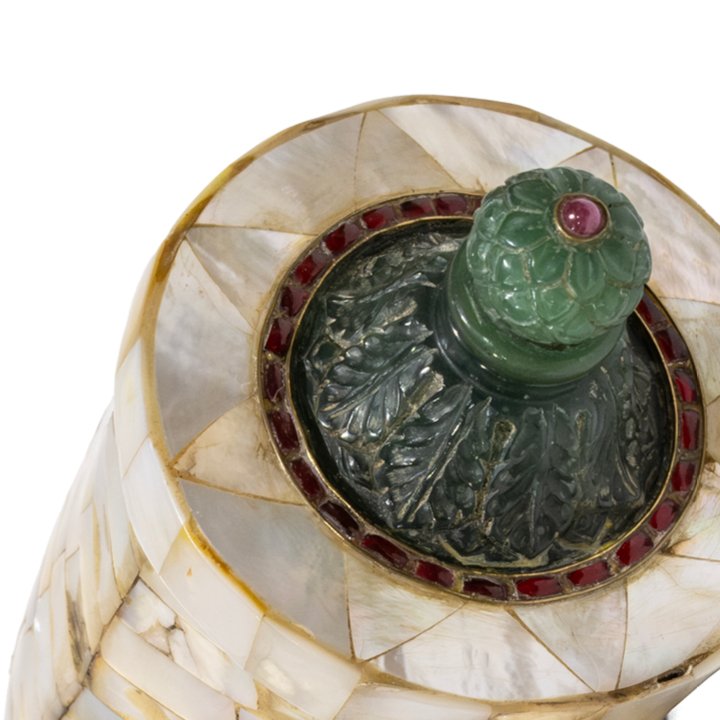 A nautilus-shaped powder flask entirely covered with evenly toned mother-of-pearl plaques, precisely cut and applied in tight formation. The surface is smooth and uniform, with a soft iridescence. Topped with a carved green jade stopper, shaped as a lotus bud.