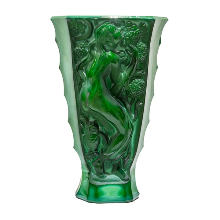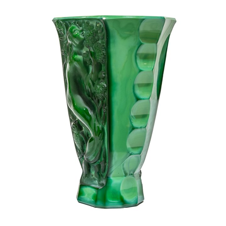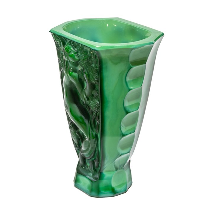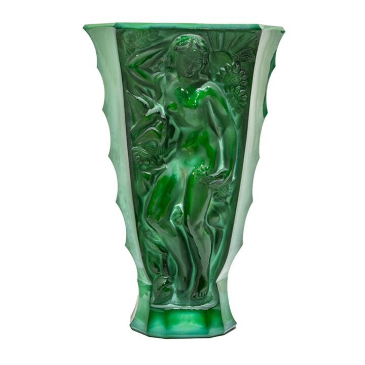 An Art Deco vase in flaring trapezoidal form, cast in green malachite-effect pressed glass. Each of the two panels features a high-relief classical female figure set against a radiating sun and stylized foliage. The surface alternates between polished and satin textures. The sides are slightly scalloped, tapering toward a faceted base. Preserved in great vintage condition.