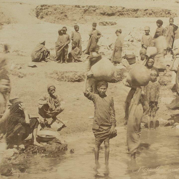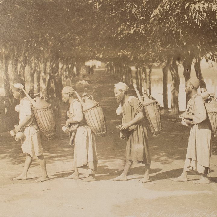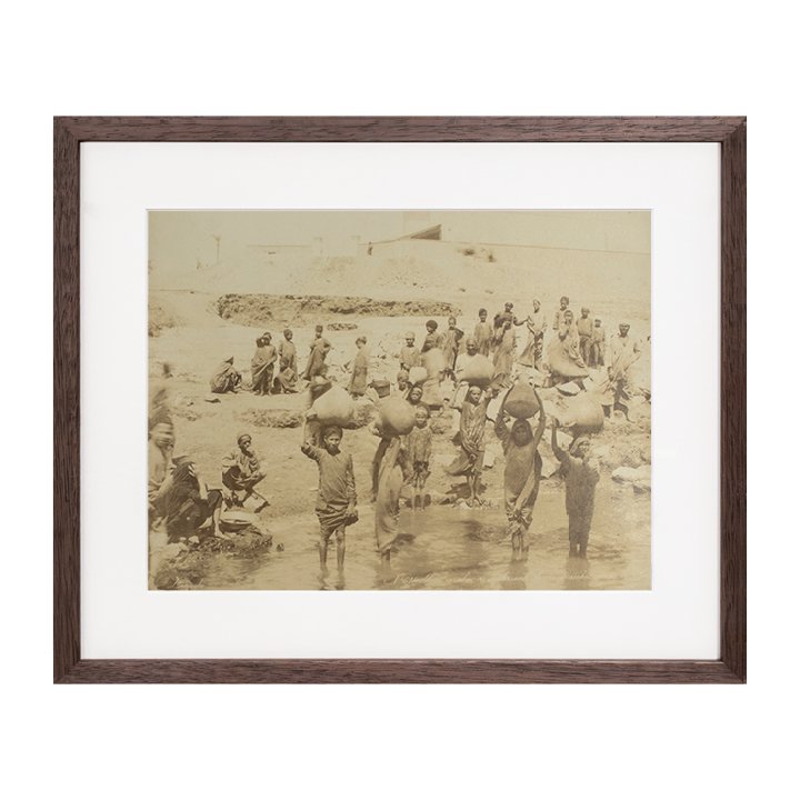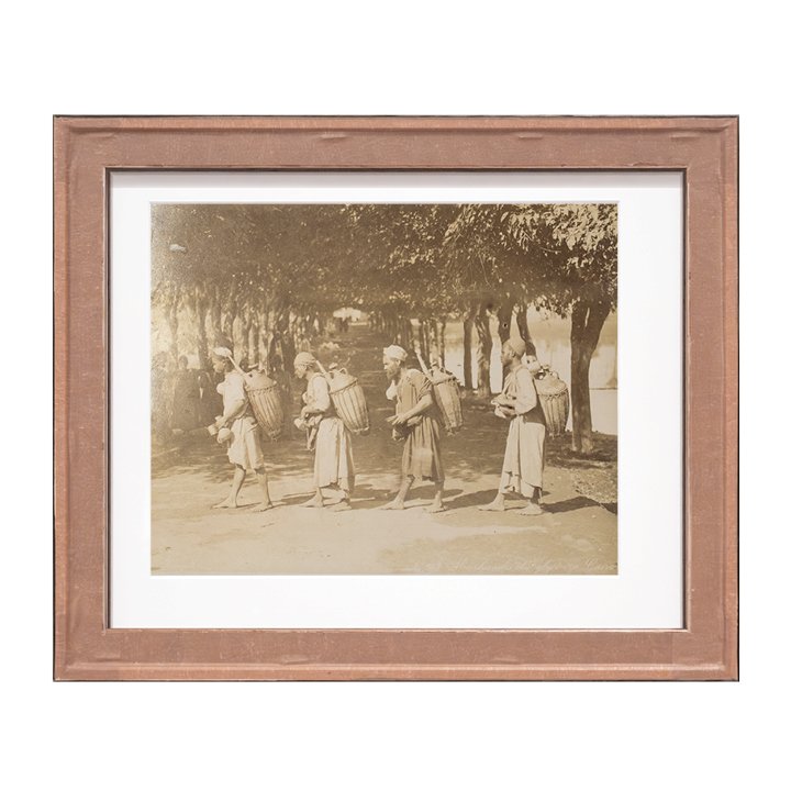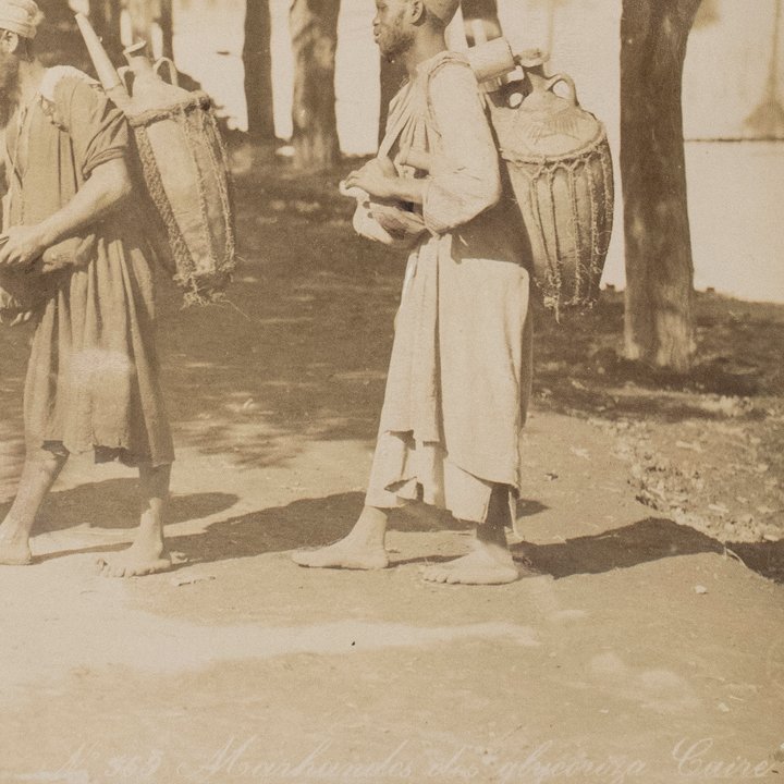 Antique albumen prints, mounted on a cardboard and framed. The recto side depicts a group of young in water, titled "Nr 619 Les Arabes remplissente leurs cruches dans le eau." The verso side titled "Marchandes des Glycoriza Caire" is capturing an environmental portrait of four men carrying water jugs. Both prints hold signatures "Zangaki" on the lower left. Slight signs of wear and fading. Newly framed.