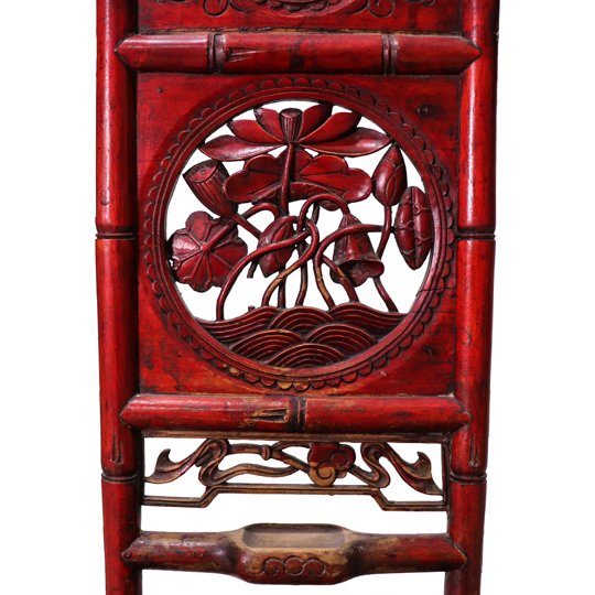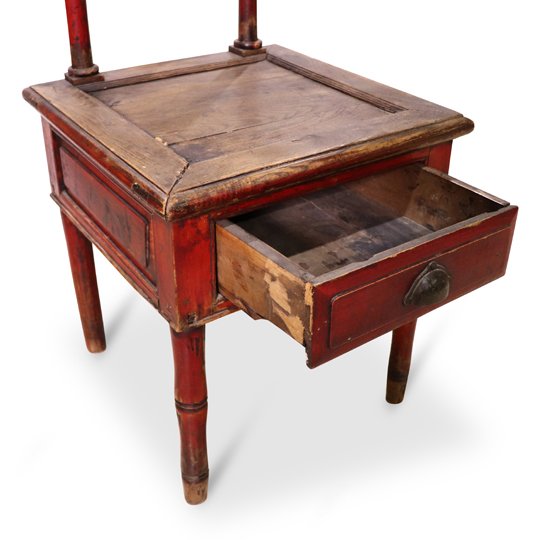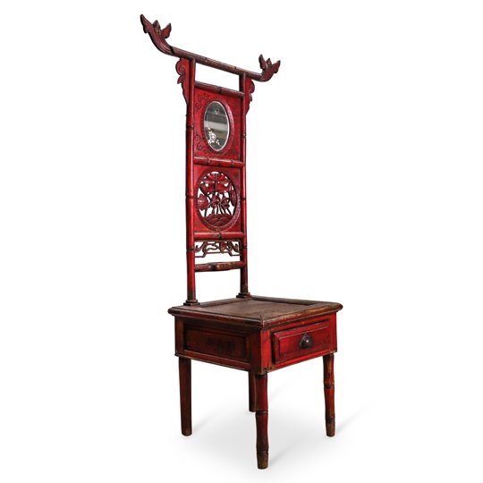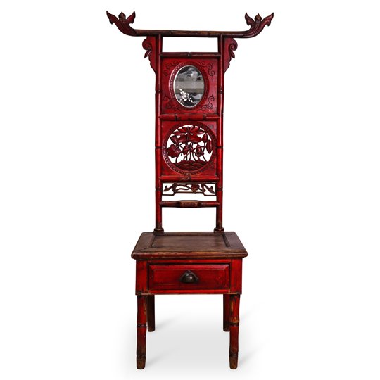 A wooden red Chinese washbasin stand. The elongated back is carved to depict bamboo on the sides and floral elements in the center. A small oval mirror is placed at the top which also has small floral engravings. A small drawer exists under the seat.
