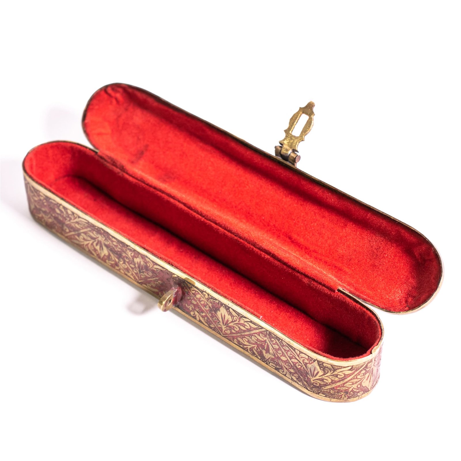 Perfectly preserved pen case in brass inlaid with floral  motifs:  internal  upholstery in red woolen cloth; closing hook