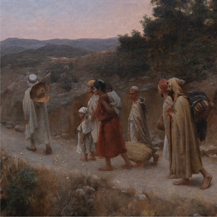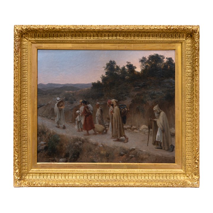 An Orientalist painting by French artist Paul Lazerges, depicting men and boys returning along a rural path in Algeria at dusk. Their burnous and turbans are rendered with naturalistic precision, the procession contrasted against the fading light of the hills. Signed and dated lower left “PAUL LAZERGES / 1885.” Preserved in excellent antique condition, the original frame underwent a minor retouching.