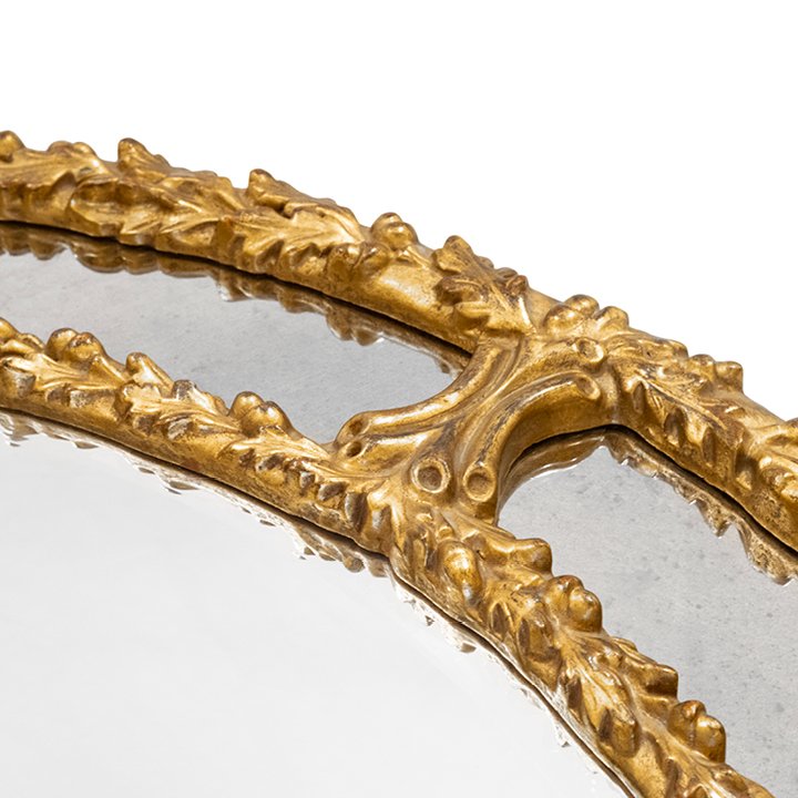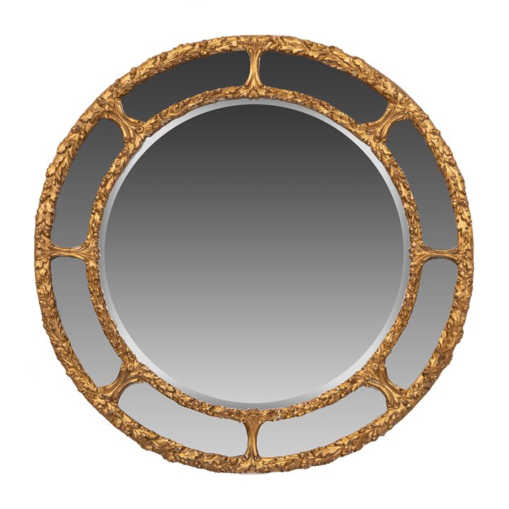 Large round gilt wood mirror in a style of Rococo Revival by Italian designer La Barge.  Hand-carved and hand-gold leafed, the mirror showcases intricate details with an ornate oak leaf and acorn motif. Large beveled round mirror is surrounded by eight  individual mirror panels with beveled edges.