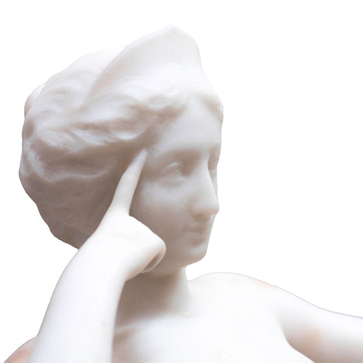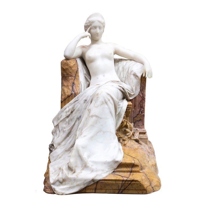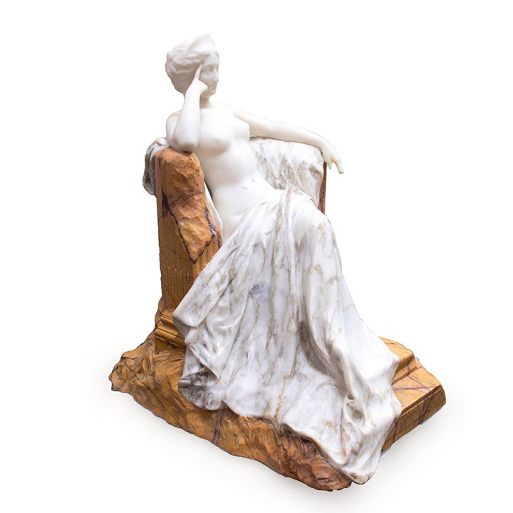 A sculpture of a classic Roman female figure in white marble finely carved, sitting on a yellow marble throne. A missing finger on her hand had been restored.