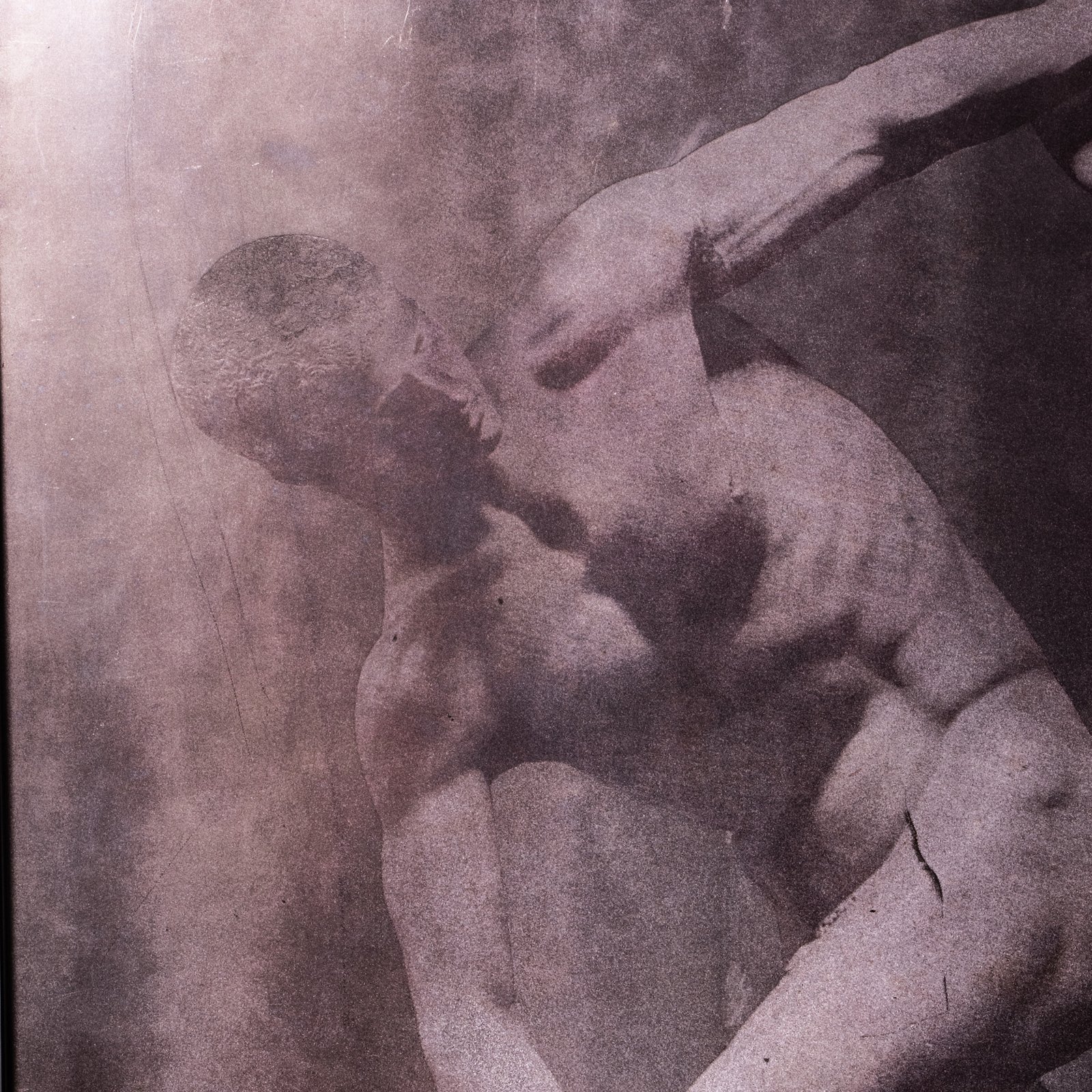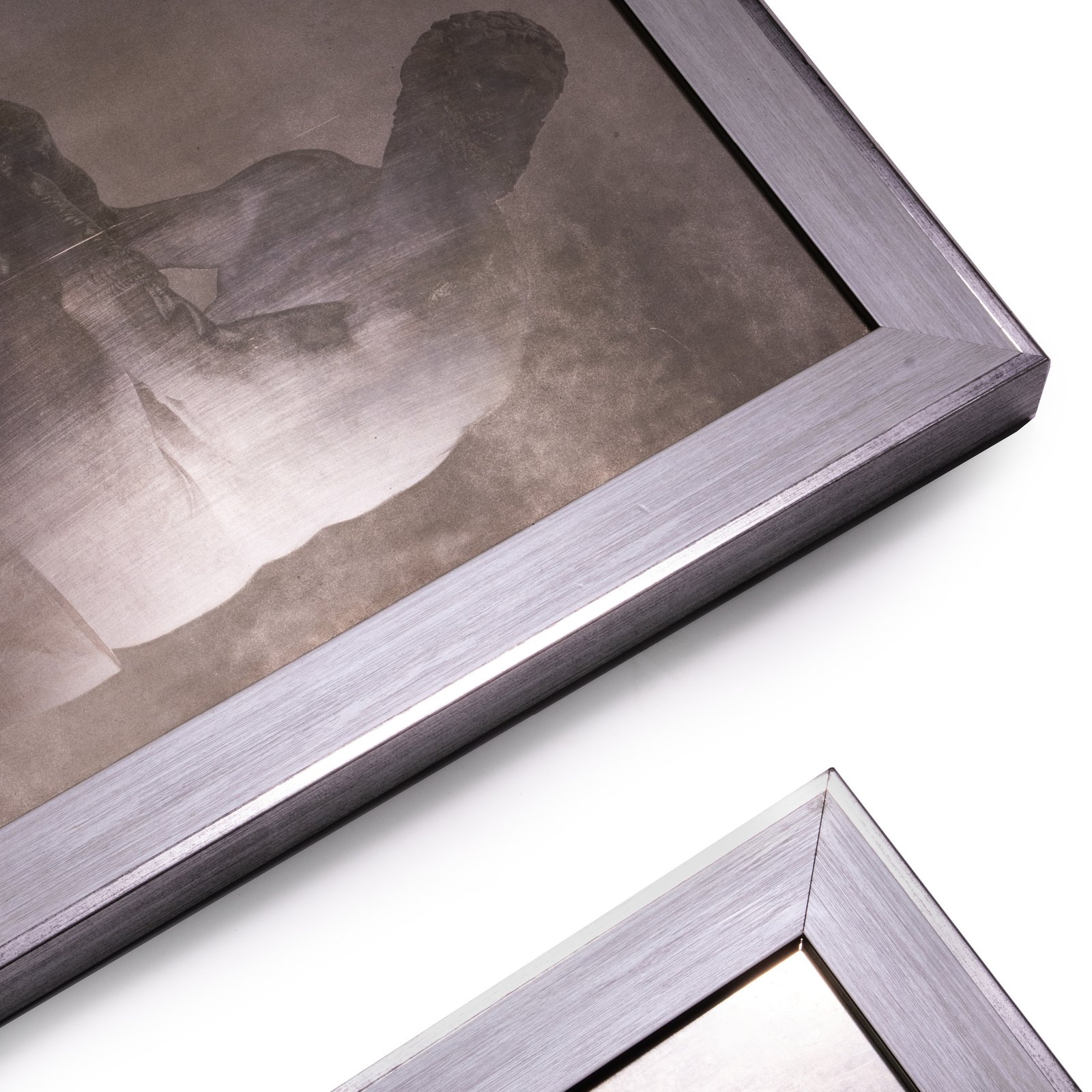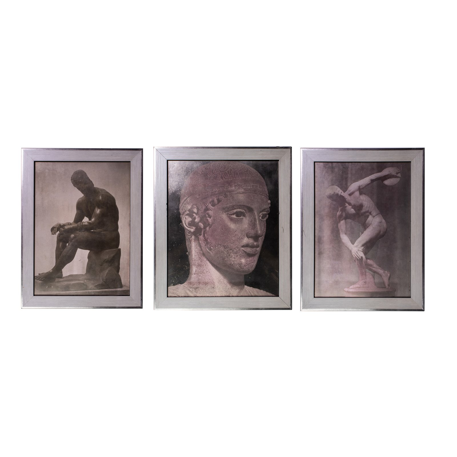 Set of three metal chiseled plates depicting Greco-Roman artworks.