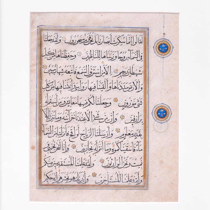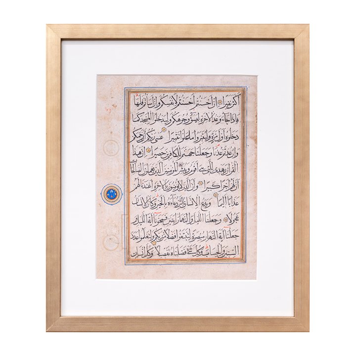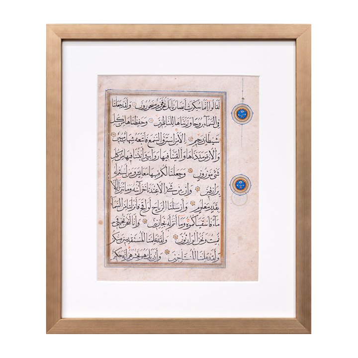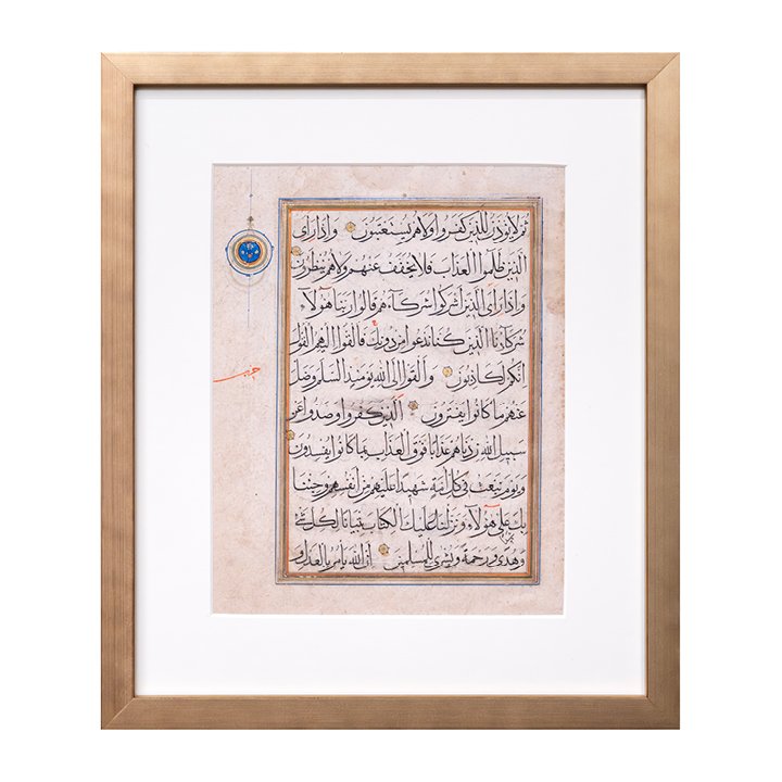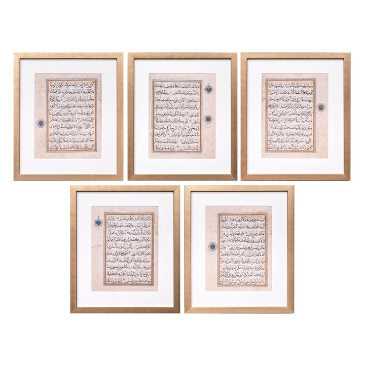 A set of five Qur’an folios from a Safavid. Arabic manuscript on paper, each folio written double-sided with ten lines of bold black naskh script within orange, blue, and gold ruled borders. The text is punctuated with gold rosette verse markers and accompanied by polychrome and gilt marginal medallions. Newly framed under museum glass.