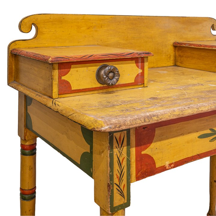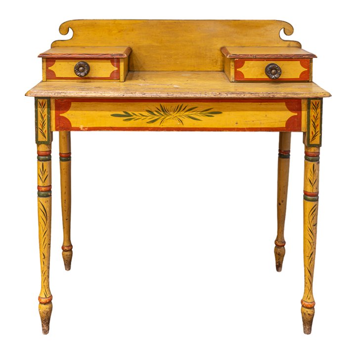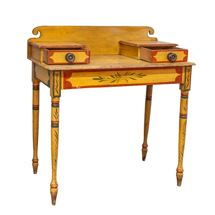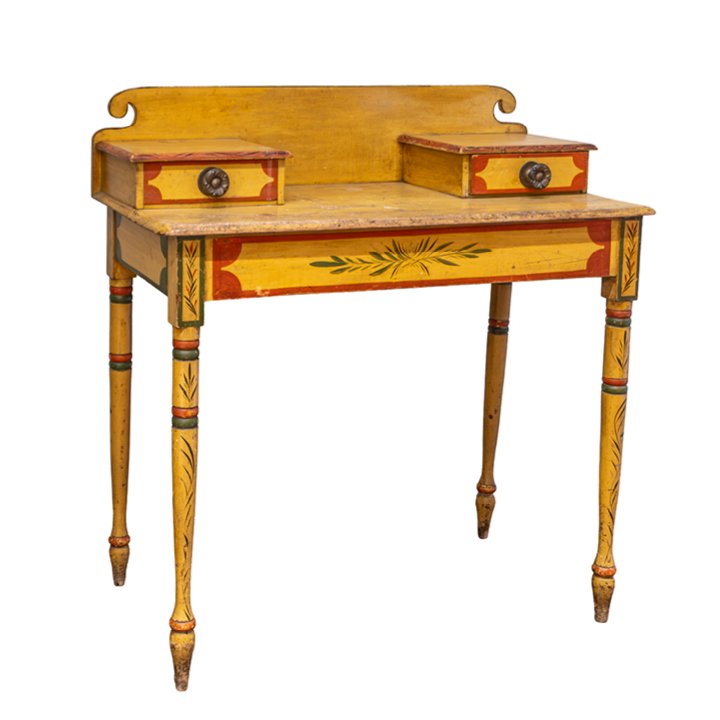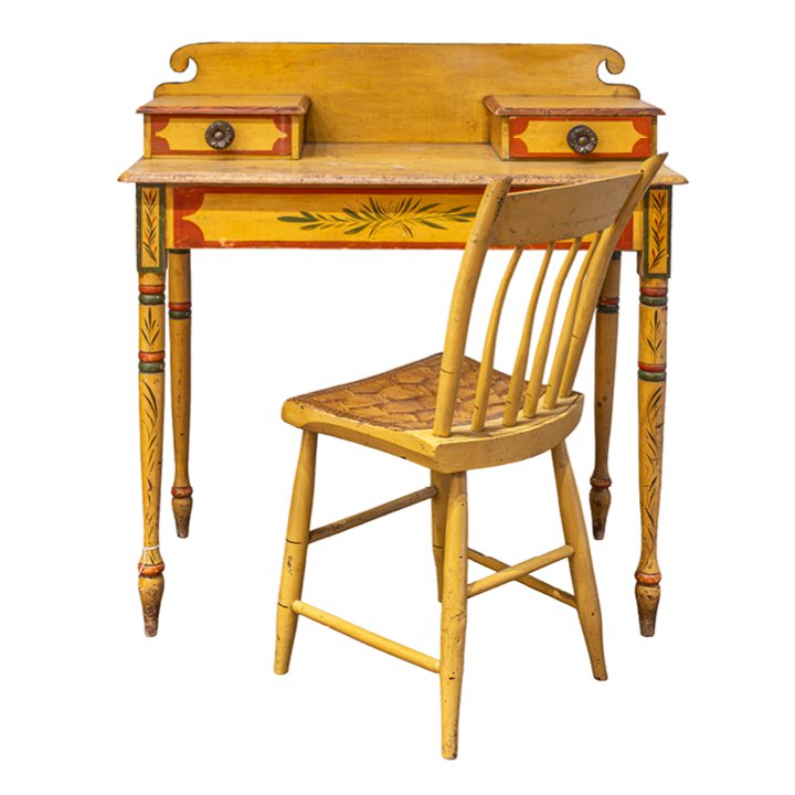 Fine classical polychrome paint decorated pine dressing table with matching Federal fancy yellow painted Windsor side chair, attributed to Maine, circa 1825–1840. The dressing table features a rectangular top with a raised back, fitted with two small drawers above a single frieze drawer, retaining original hardware. Raised on turned tapering legs with painted banding and floral motifs.