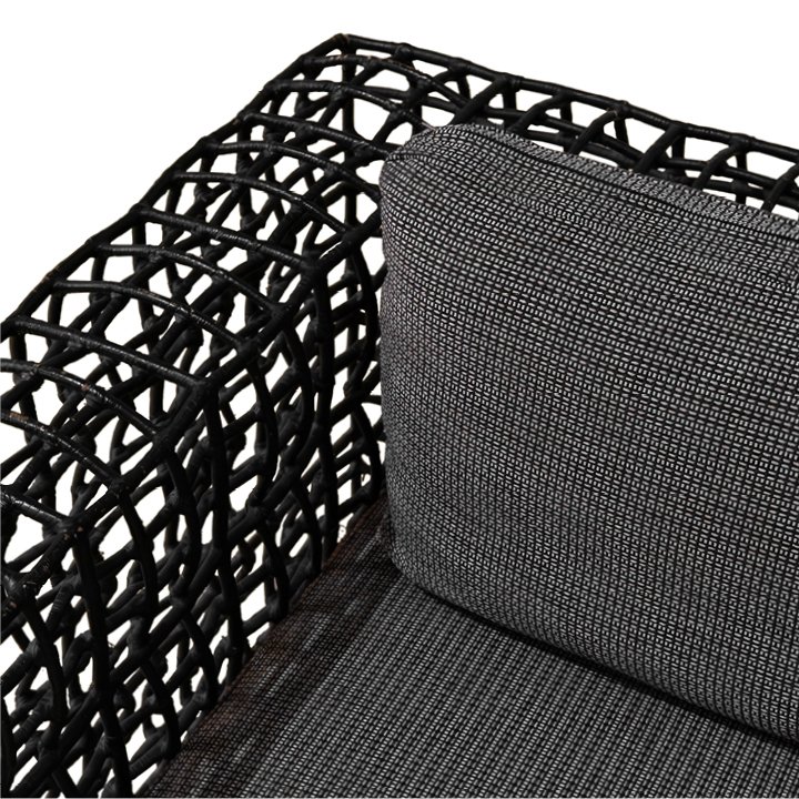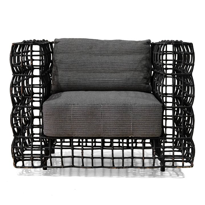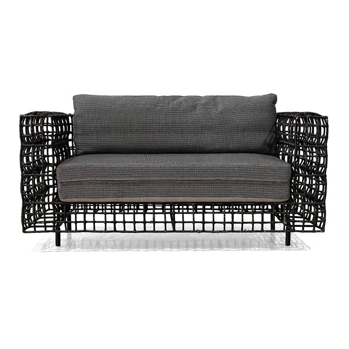 Set of Mid-Century Modern sofa and armchair with open metal-net bases. Constructed from welded steel rods forming a geometric lattice, both pieces are finished in dark tone wicker and fitted with modern textured cushions. The metal surfaces show light patina consistent with age.