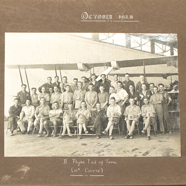 Documenting Eady’s early years as a trainee pilot at Aboukir (Abu Qir), Egypt. Includes training exercises, aircraft, airfields, and portraits of fellow cadets. The first page is a group portrait of “B” Flight at the end of term (15th Course). Photographs are mounted on dark brown cardboard with spider-net paper protection. Most pages inscribed. Great vintage condition.