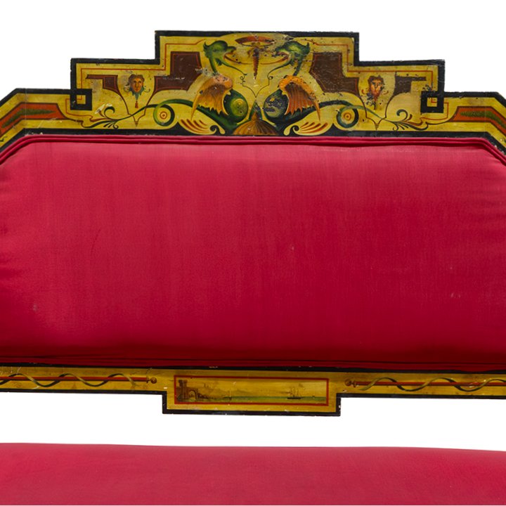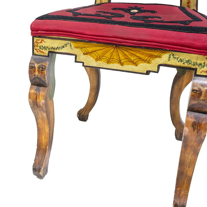 Constructed in molded and carved poplar, the frames are polychrome-painted in a vivid palette, featuring grotesque motifs, stylized florals, and mythological elements. The sofas are distinguished by eagle-head armrest supports and anthropomorphic front legs, the chairs feature griffin motifs on the backrests and similarly carved legs.