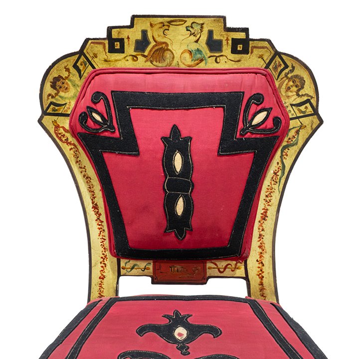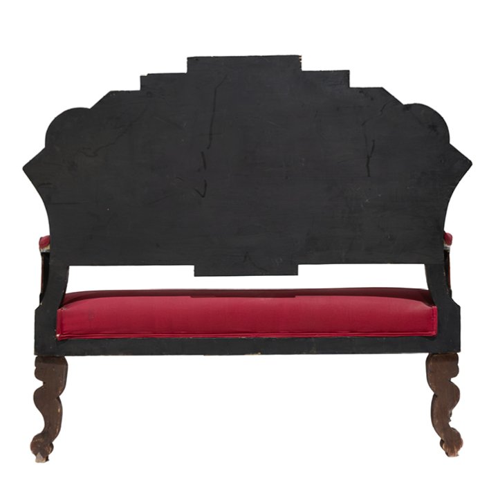 All pieces are upholstered in red cotton fabric with contrasting black felt applique in geometric patterns. The painted surfaces exhibit minor wear consistent with age. The set has undergone partial restorations and presents in stable condition.