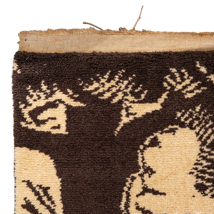 Unique wool woven rug or a wall hanging. Composition in beige and brown hues depicts donkey riders on a background with trees and mountains. Minimalistic yet curious design. In great vintage condition, the wool is soft, full pile, and well preserved with original salvages.