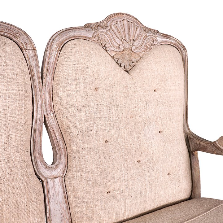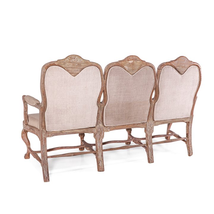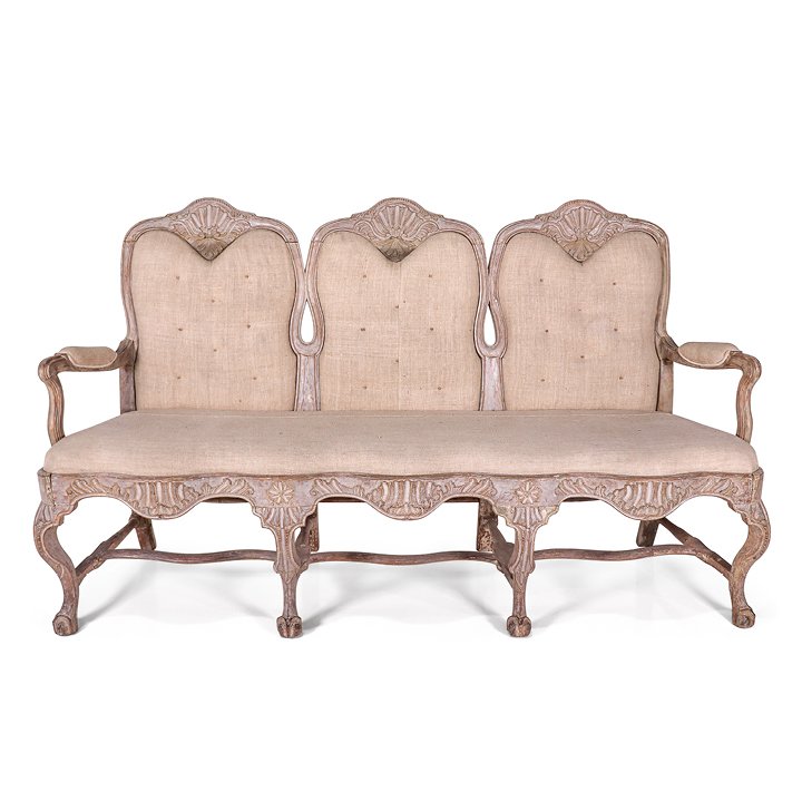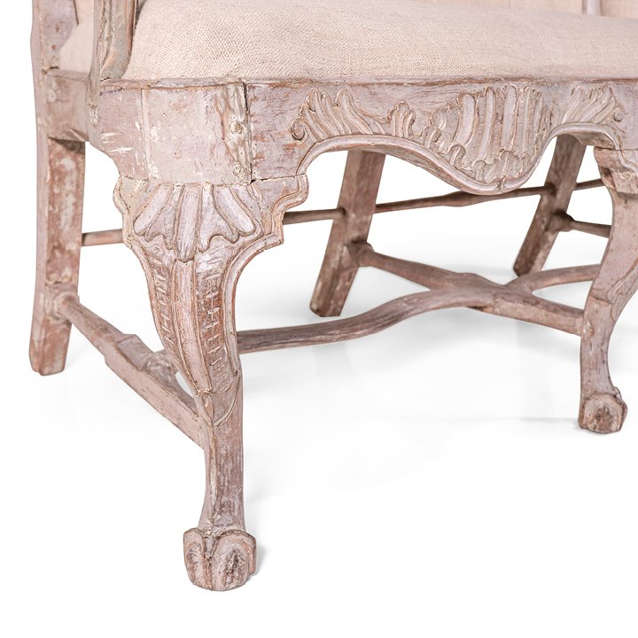 Elegant three-seater from Sweden. This Gustavian sofa (or canapé) padded back and a stuffover seat, raised on cabriole legs. Frame made from carved wood with original paint and upholstery in dust-pink fabric.