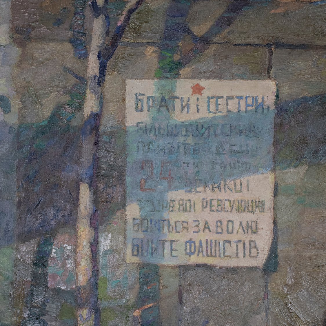 A Soviet Realism post-war painting depicting a scene from WW2, depicting three-man figures and a propaganda poster (The Bill) on a wooden fence. Signed by the artist and dated 1965.