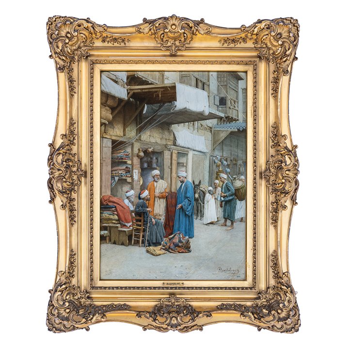 "The Carpet Seller" is an impressive medium-size watercolor painting in original giltwood frame, depicting a Middle-Eastern (probably Algerian) street scene. On the foreground, a rug merchant talks to his clients, while figures behind reveal more details – a boy with a donkey, man carrying a basket on his back – all depicted in signature intricate manner. Signed lower right "Bartolini."