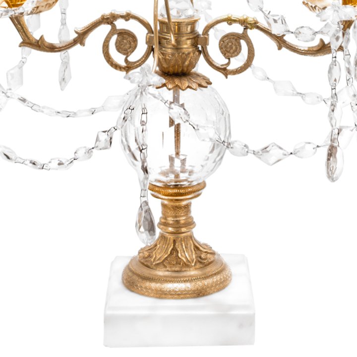 Swedish gilt brass 2-arm candelabra in distinctive Gustavian style, on white marble base. The arms of the candelabra gracefully curve outward, and each is adorned with delicate crystal prisms and that beautifully reflect and refract the light. The body is topped with large ball-cut crystal and feature extra-long prismatic-cut crystals.