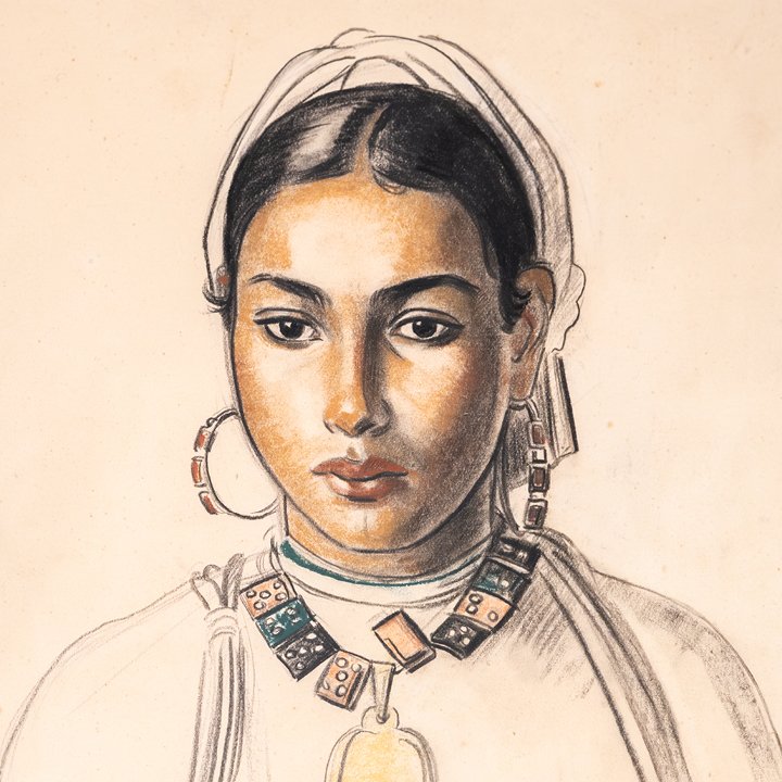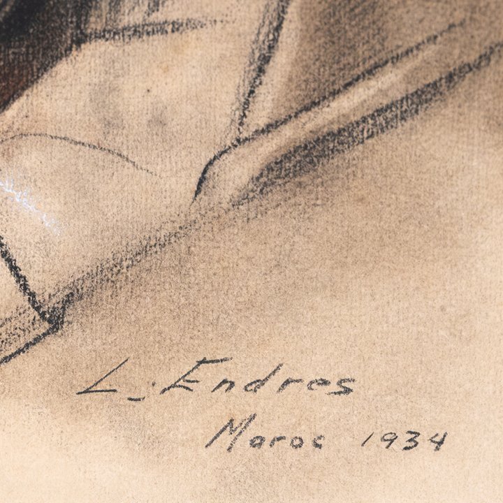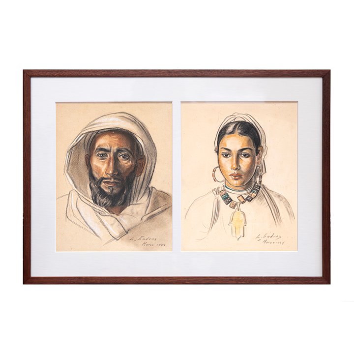Pair of portrait studies showing a man and a woman in traditional attire, drawn in Morocco in 1934 by Louis John Endres. Created using sanguine and black chalk with pastel highlights on beige tone paper, each portrait focuses on the model’s expression and clothing against the paper’s neutral background. The precise linework and careful color accents reflect Endres’s artistic practice in his Rabat studio during the 1930s. Both drawings are signed and dated lower right. Newly mounted in one wooden frame under glass.