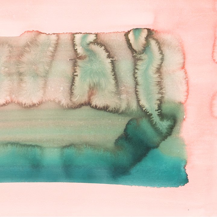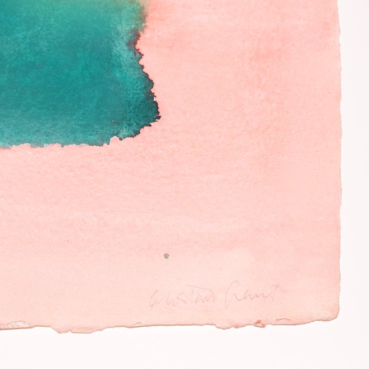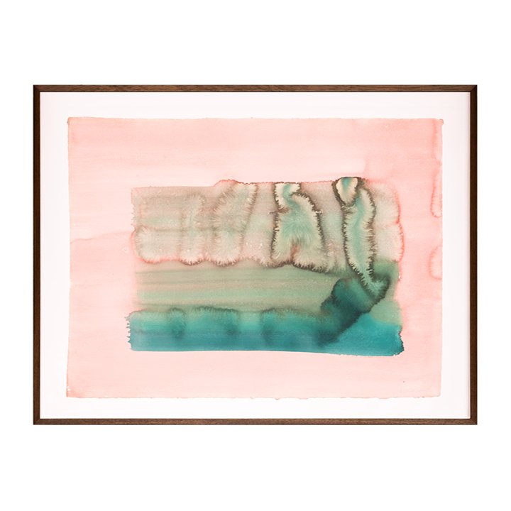Abstract watercolour on paper painting in contrasting pink and green hues. Signed lower right.