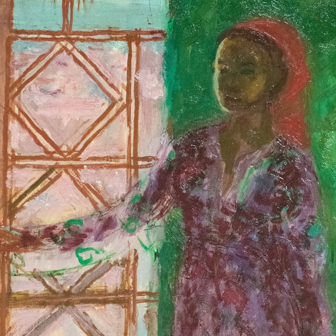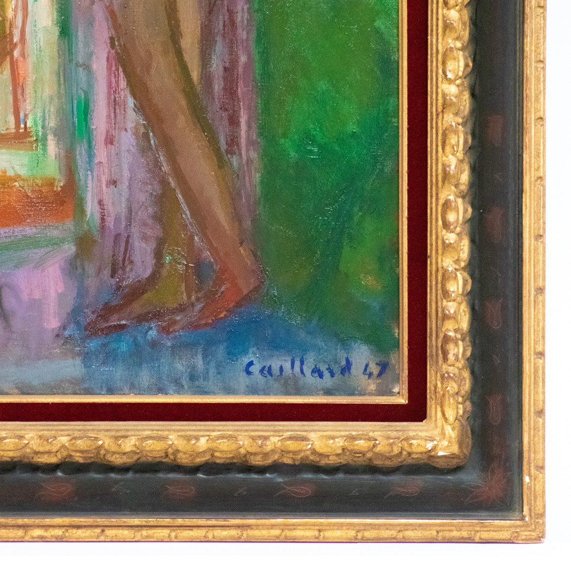 Orientalist oil on canvas full-length portrait of a lady standing next to a door. Created in the 'native-colored' reality style, it is a distinctive Caillard piece, that shows his appreciation of beauty diversity. Poetic work of light and color combines brushstrokes in vibrant colors and shows intricate details of the dress and the room interior. Artwork signed and dated 1947 right at the bottom.