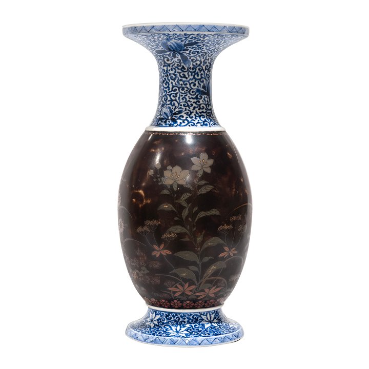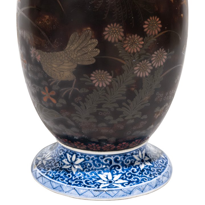 Pair of fine ceramic hand-painted vases, decorated in a color-block manner: the center parts in dark earthy tones are depicting roosters and hens in a garden, the tops and the bases are adorned with distinctive blue-on-white floral and fruit pattern on scrollwork background. Preserved in good antique condition, occasional signs of aging.