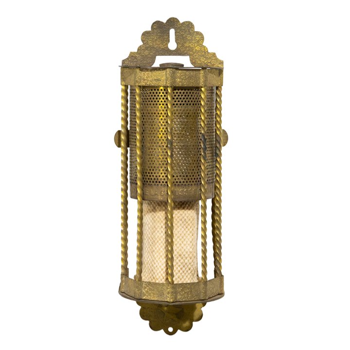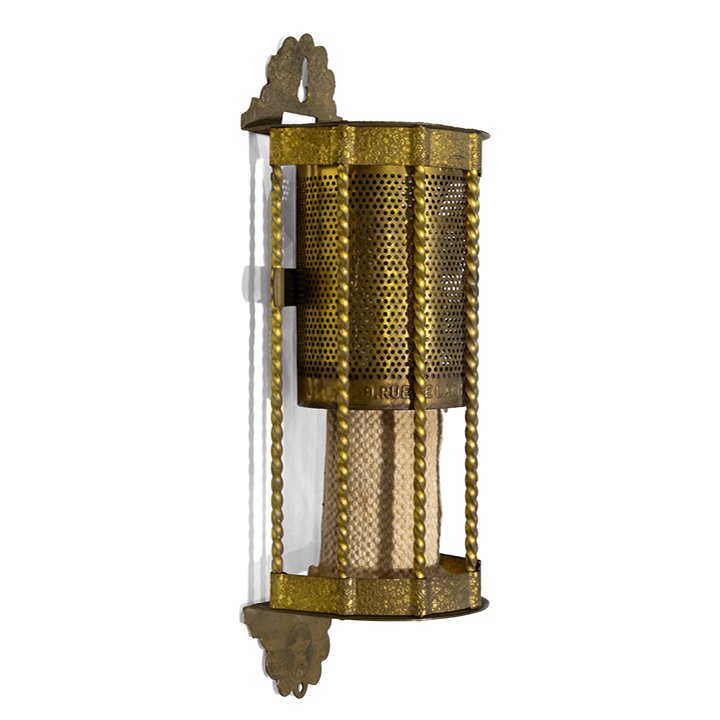 A wall-mounted ozonator and perfume diffuser in pierced gilt brass, with floral detailing and twisted supports enclosing a central glass chamber and braided cotton wick. Designed to purify or scent indoor air, the piece is fitted with a suspension hook for wall display.