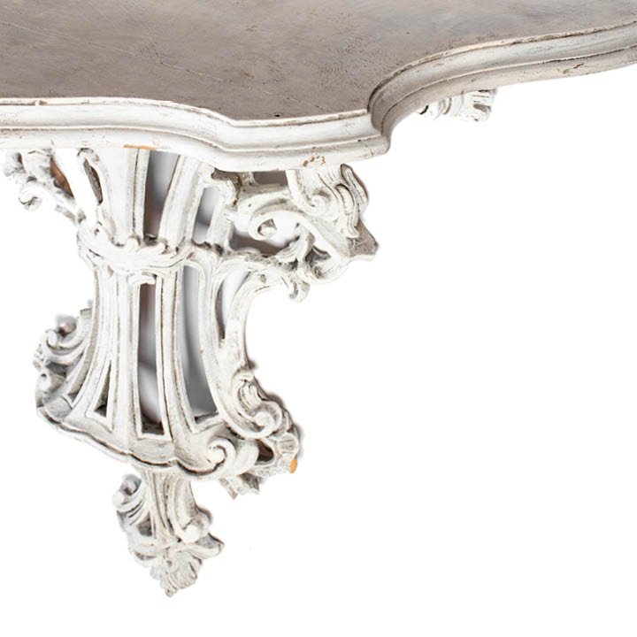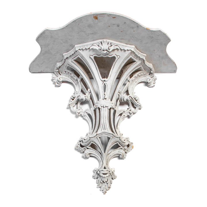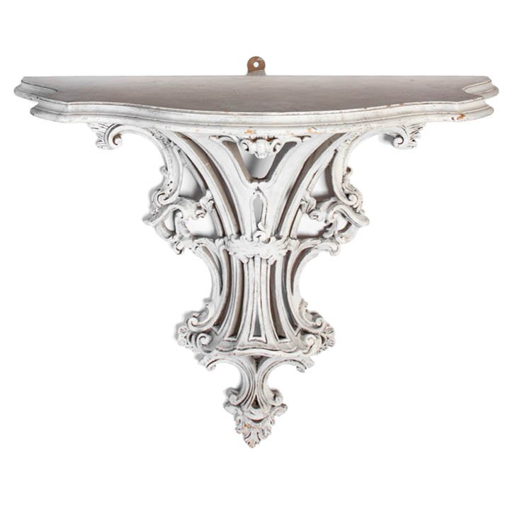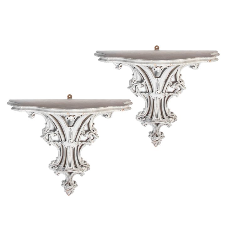 Carved wood and white gesso console wall brackets in Rococo Revival style. Each features semi-circle curved shelf over ornate base with distinctive rocaille scrolls decoration. May be purchased either together as a set or separately.