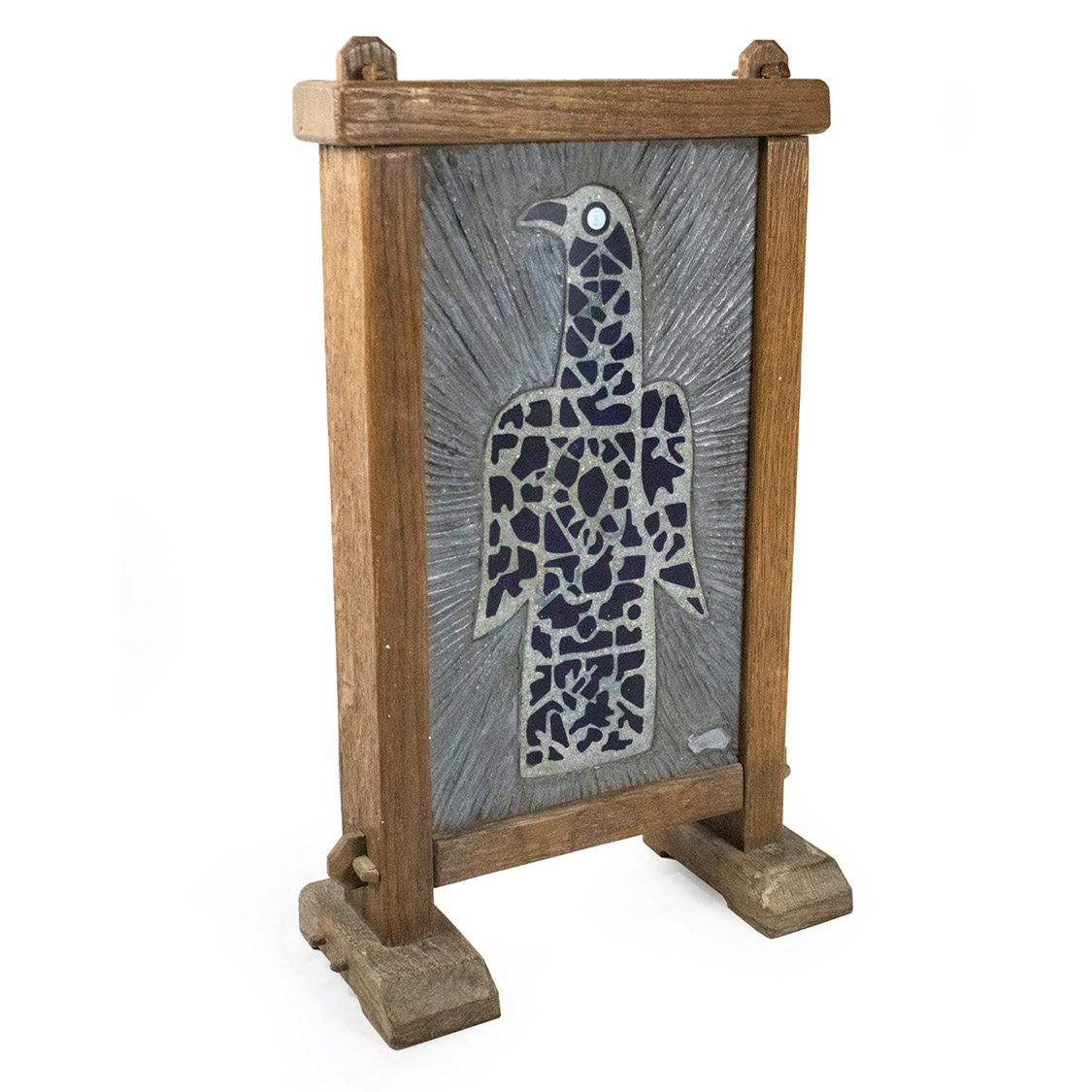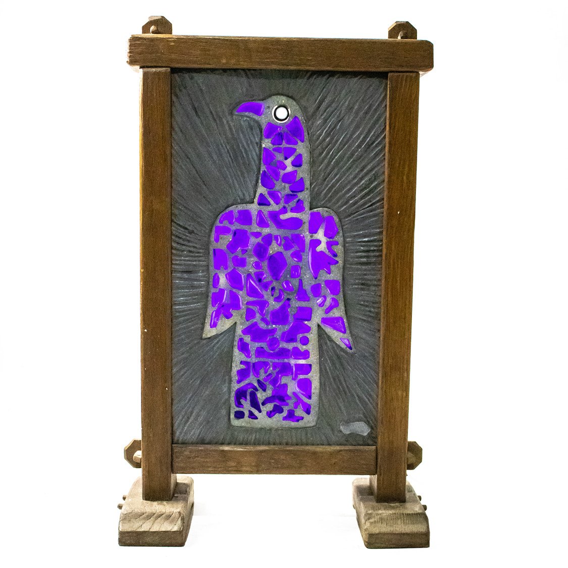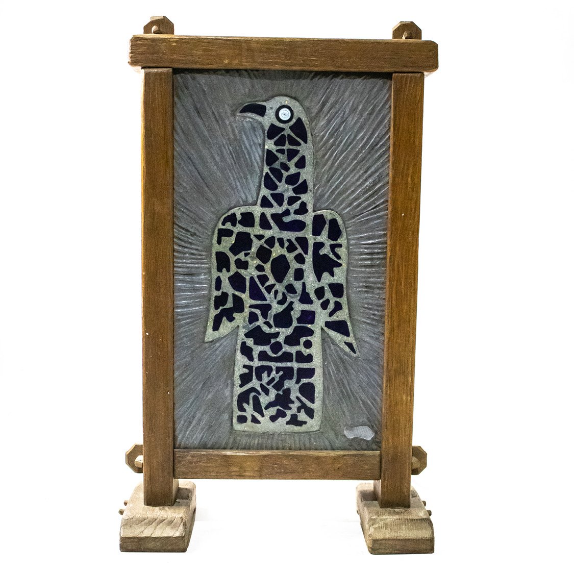 Wooden table lamp with a blue-purple glass mosaic of a Visigothic eagle. G-plug provided.
